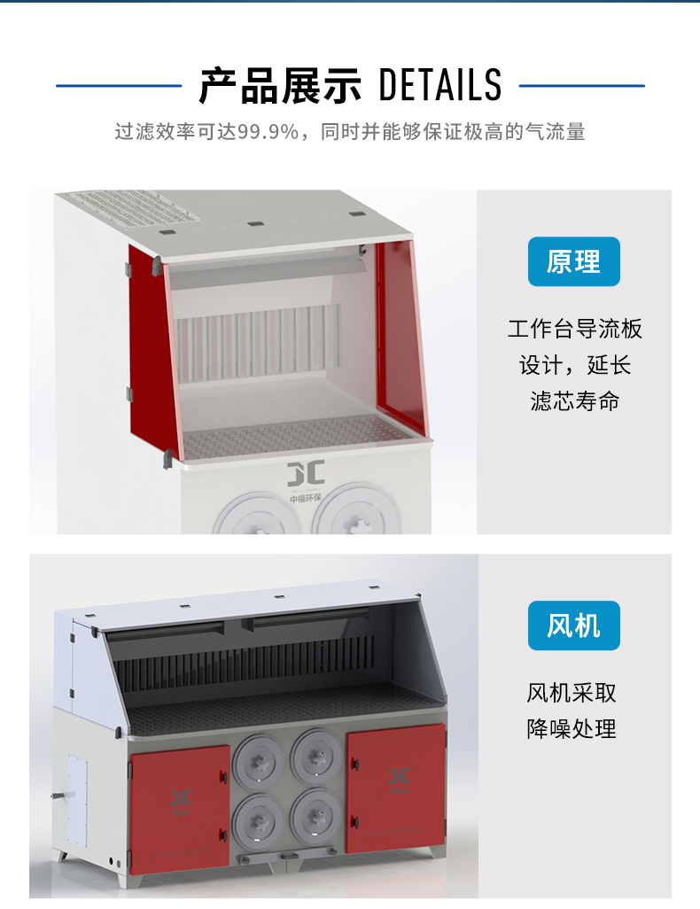 1、抽風工作臺進風口處設置一導流板,用于防止含塵直接沖擊濾芯,從而延長濾芯的使用壽命。